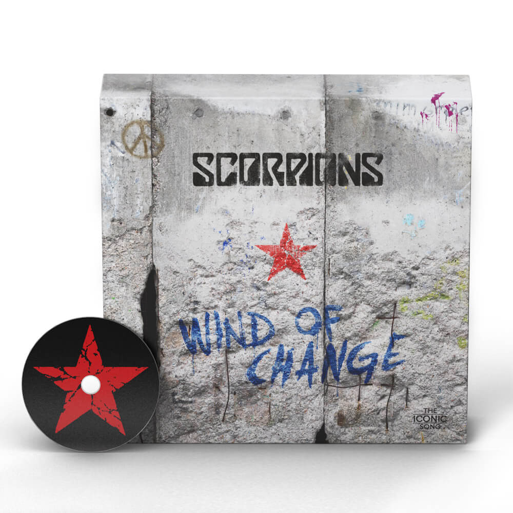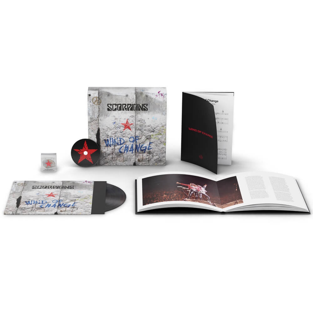 Next to the book the box set includes a vocal and piano arrangement of “Wind of Change” as well as a CD and 12” LP with 5 versions of the song: the original album version, the Berlin Philharmonic version, the Russian and Spanish and an unreleased demo version by Klaus Meine. Heart and centerpiece of the box set is a handcrafted unique piece of the Berlin Wall customized with the red “Wind of Change” star and a handwritten lyric by Klaus Meine.
