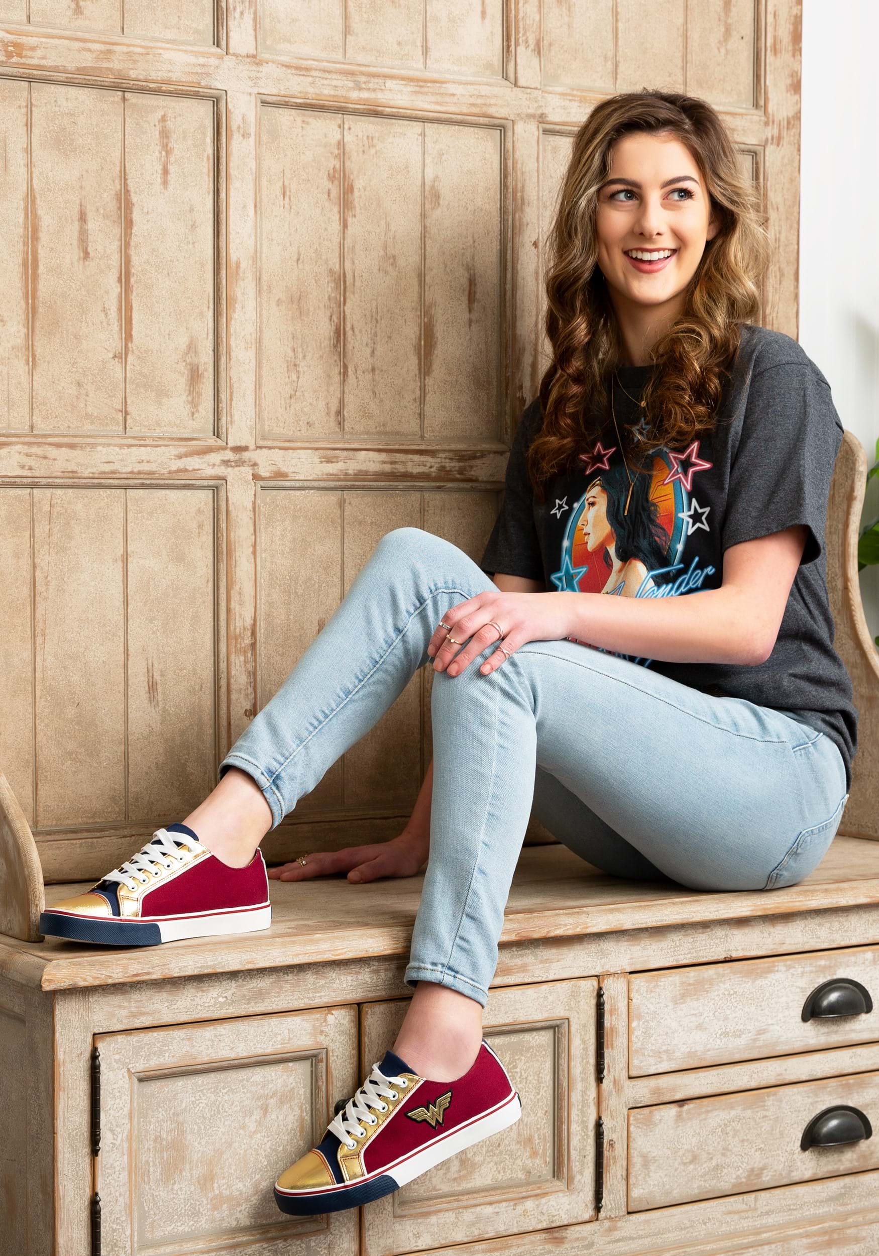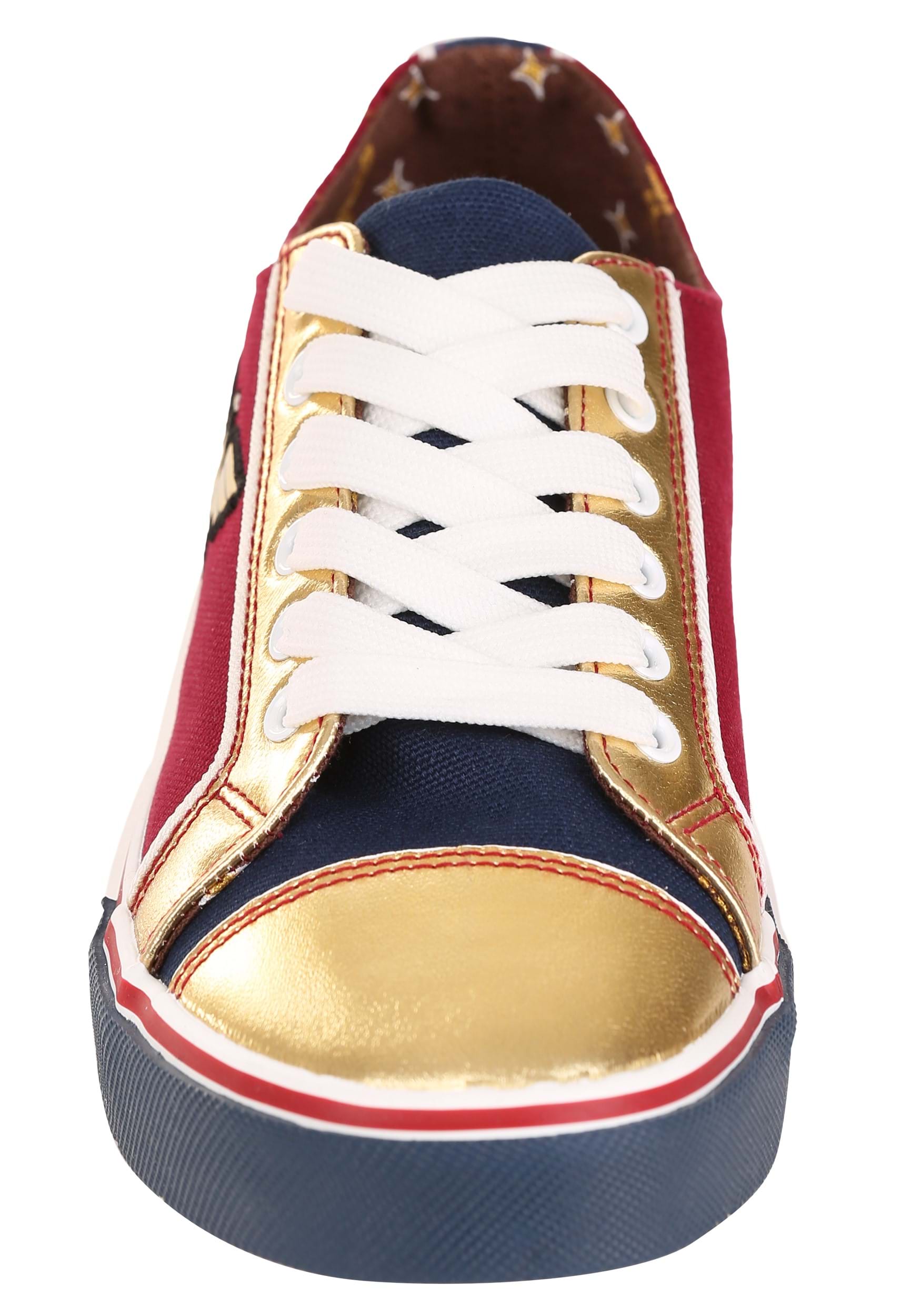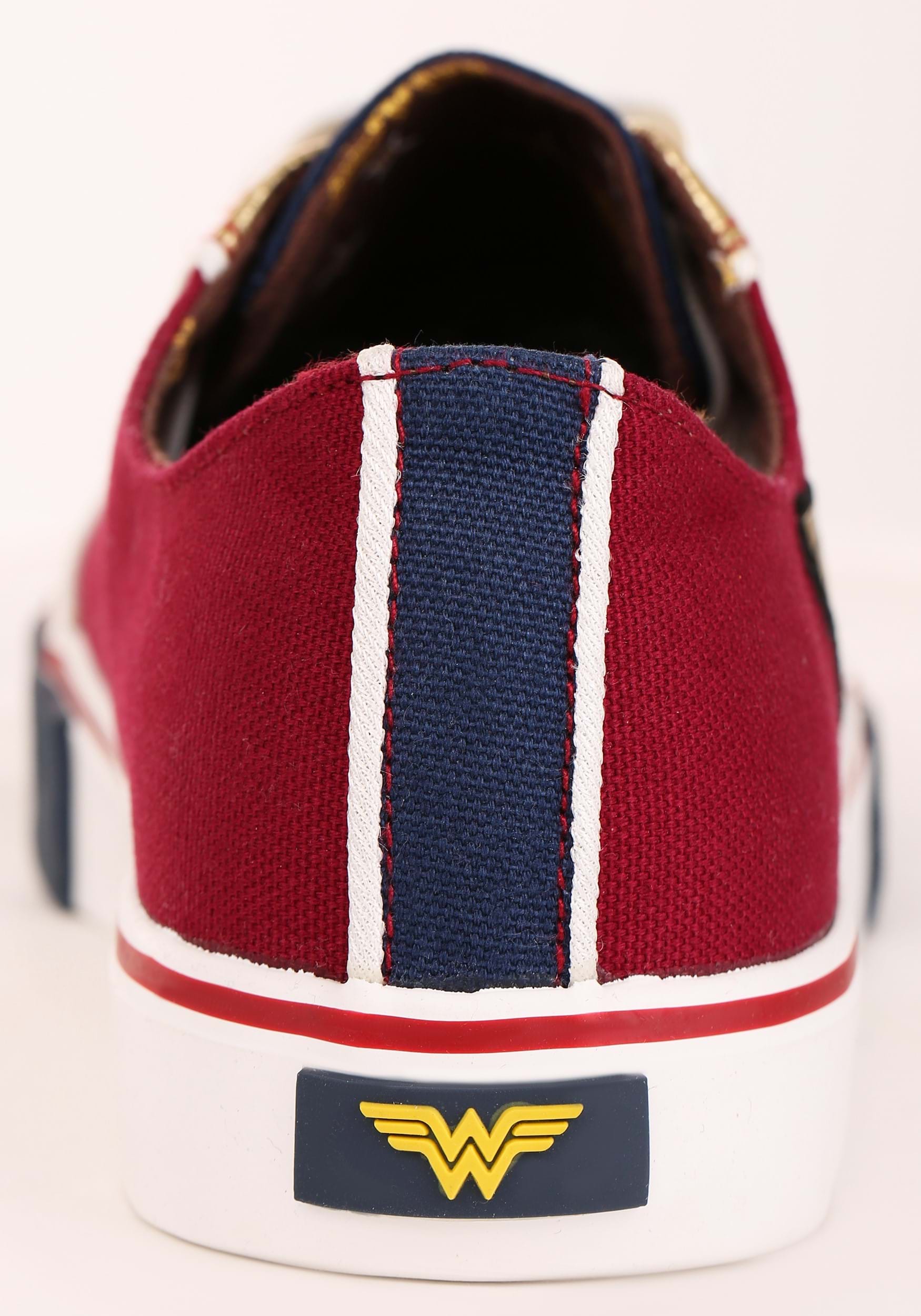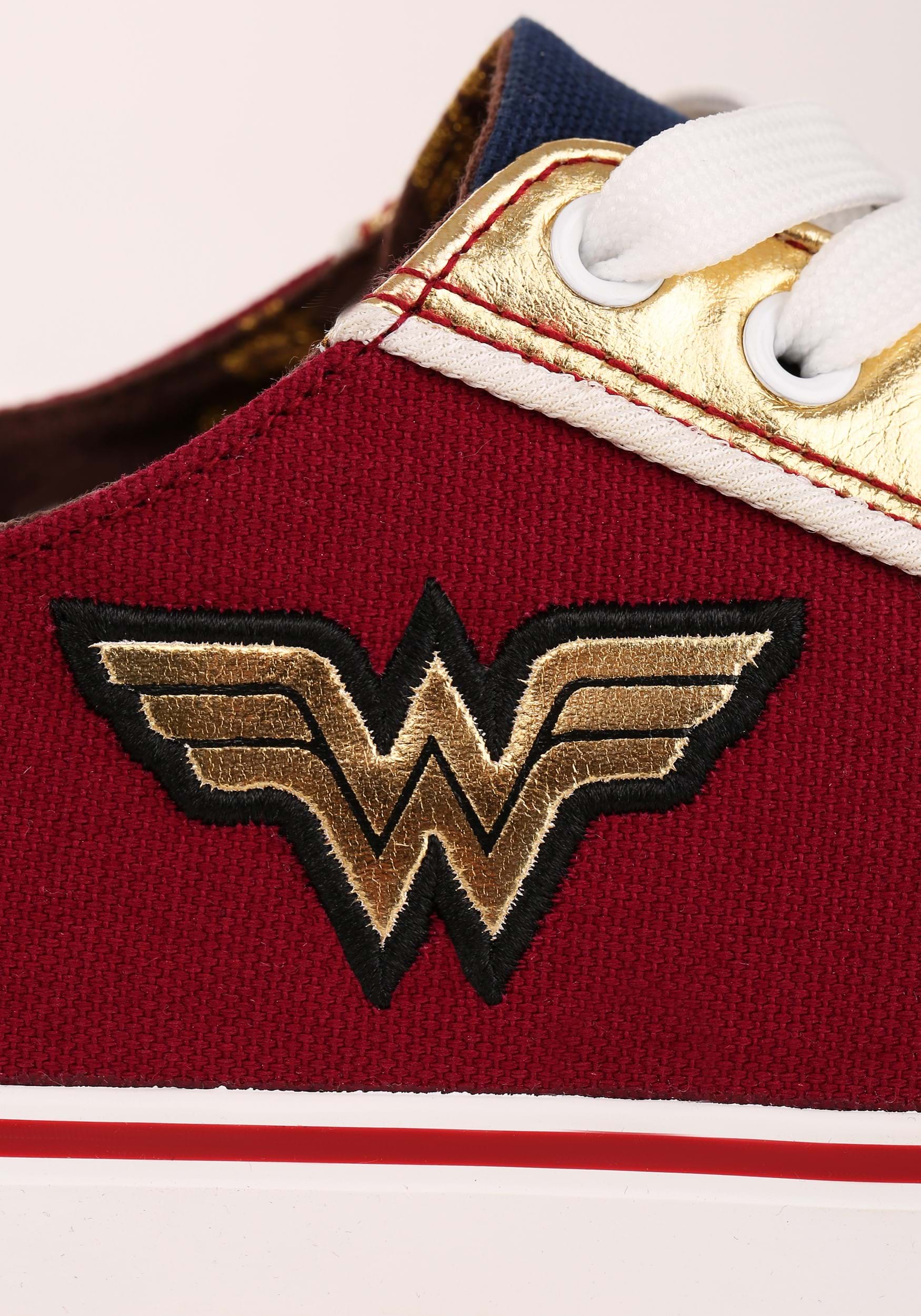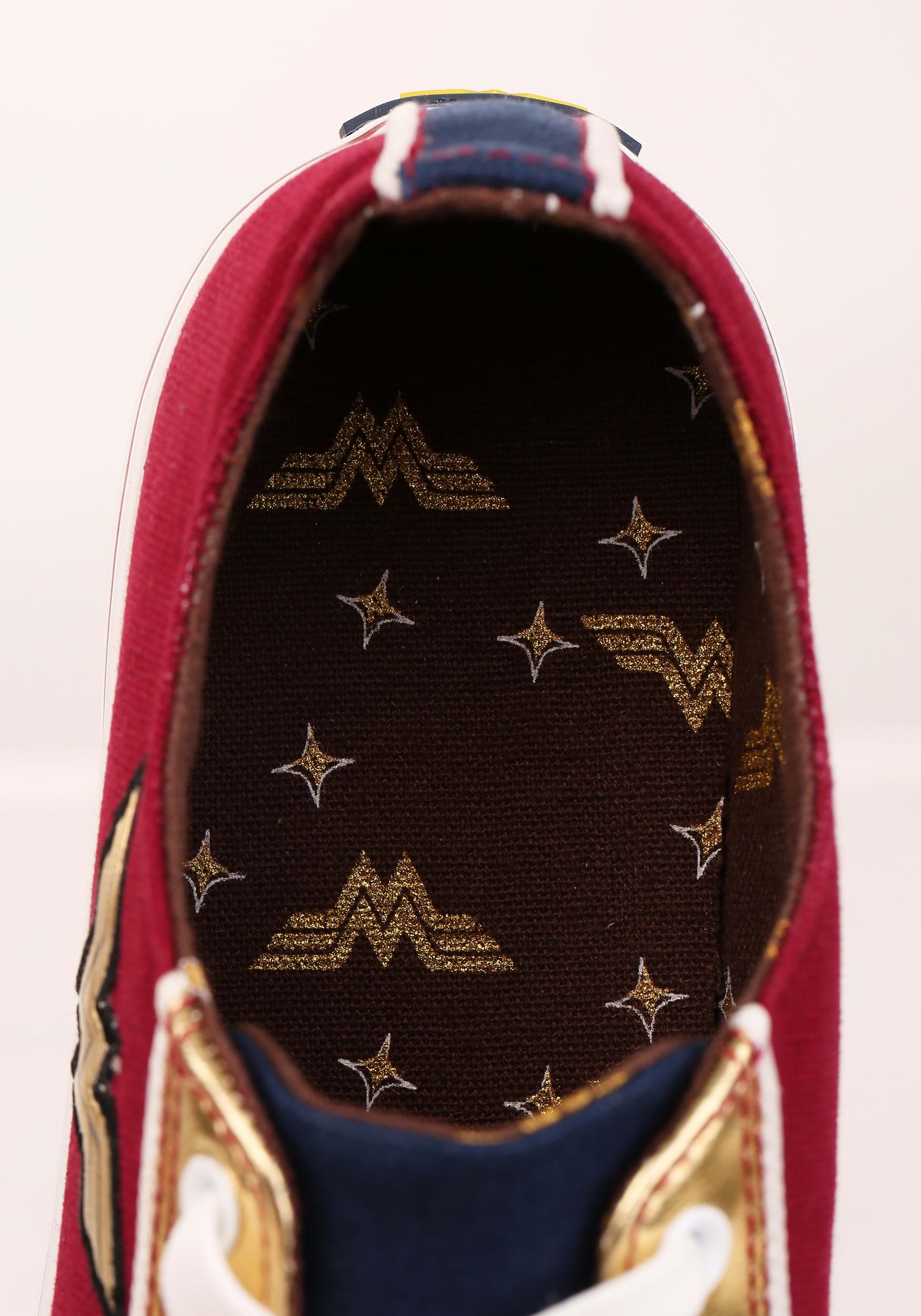Immortal Amazonian demigod more your style? These Wonder Woman sneaks will make you look like you’re fresh from a trip to Themyscira. Inspired by the infamous color palette of Wonder Woman’s armor, these low tops feature a primarily maroon body with navy accents. The metallic gold toes and throat will make you feel as if you have your very own Lasso of Truth, and it truly makes the rich colors pop! A gold, double-W patch embellish the sides, well stitched with a black thread outline. Bright white laces and a logo-patterned inner lining round things out to make them the perfect addition to any outfit. You’ll be ready at a moment’s notice to fight for justice and defend the world!