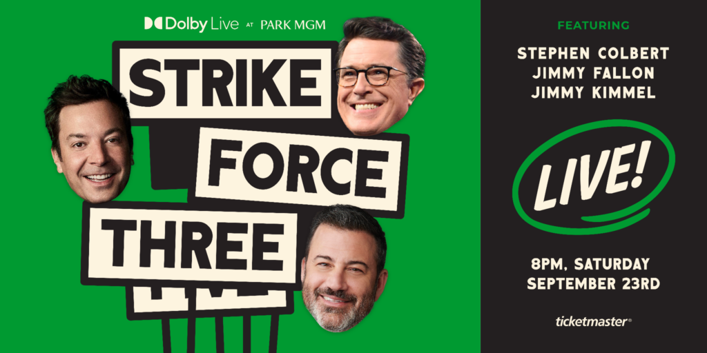 “Strike Force Five Three,” hosted by three of the biggest names in late night television, comes to Dolby Live at Park MGM in Las Vegas, NV on Saturday, September 23, 2023. This one night-only exclusive live event features network hosts Stephen Colbert, Jimmy Fallon and Jimmy Kimmel on stage together for the first time.