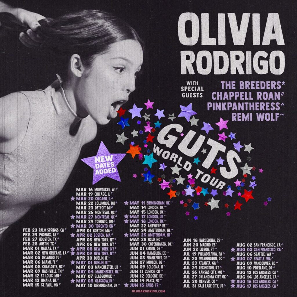 Due to incredible fan demand, multi-platinum, three-time Grammy award-winning artist Olivia Rodrigo announced 18 new dates on her highly anticipated 2024 GUTS world tour. Produced by Live Nation, the colossal global tour will now include third and fourth shows in New York, London and Los Angeles, as well as second shows in Chicago, Montreal, Dublin, Amsterdam, Paris, San Francisco and more, bringing the tour to 75 dates. The tour kicks off on Friday, February 23 in Palm Springs, CA at Acrisure Arena, with stops across North America and Europe in Miami, Toronto, New York, London, Manchester, Glasgow and more before wrapping up with four massive shows in Los Angeles at the Kia Forum in August 2024. The Breeders, PinkPantheress, Chappell Roan, and Remi Wolf will join on select dates across the tour.