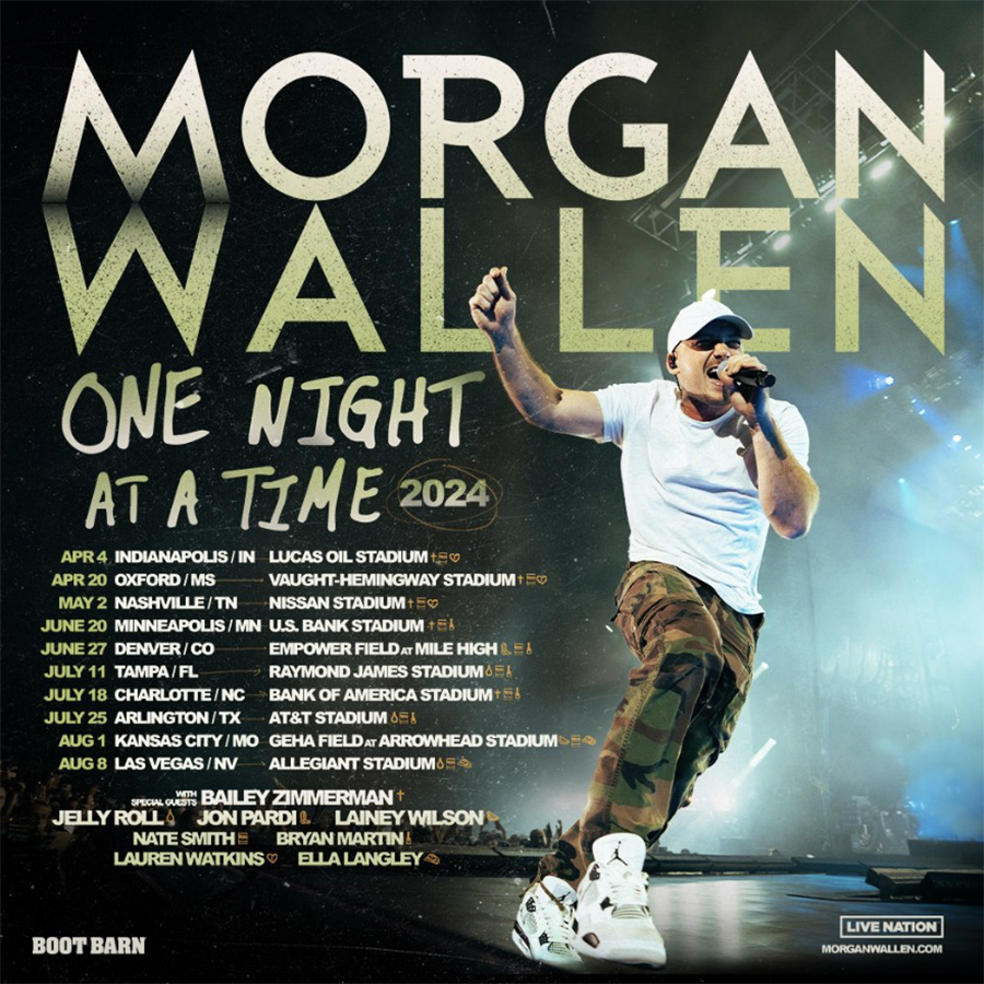 Morgan Wallen has announced that he will be extending the tour into 2024 with 10 additional stadium shows. A rotating lineup of guests including Bailey Zimmerman, Jelly Roll, Jon Pardi, Lainey Wilson, Nate Smith, Bryan Martin, Lauren Watkins and Ella Langley will join for support. Wallen’s coast-to-coast run will include stops in Nashville, TN; Arlington, TX; Las Vegas, NV and more.