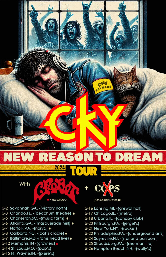 CKY have announced their Spring 2024 headline tour which coincides with the 25th anniversary of the band. Yes, CKY have been around and kicking your ass since 1999, and you know you love it! The New Reason to Dream Tour kicks off on May 1 with a solo warm-up show in Knoxville, Tennessee, and runs through May 26 in Hampton Beach, New Hampshire. Crobot and X-Cops will appear on select dates. All dates are below. Tickets are on sale now. Limited edition VIP meet and greet packages are available here.