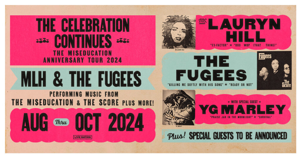 5x Grammy winner and one of the most notable hip hop, R&B, and fashion/style icons of all time, Ms. Lauryn Hill is continuing where she left off – once again reuniting with The Fugees, to co-headline an extension of The Miseducation Anniversary Tour in honor of the landmark album that was just named the best album of all time by Apple Music. The tour will feature music from The Miseducation of Ms. Lauryn Hill, The Score and more.