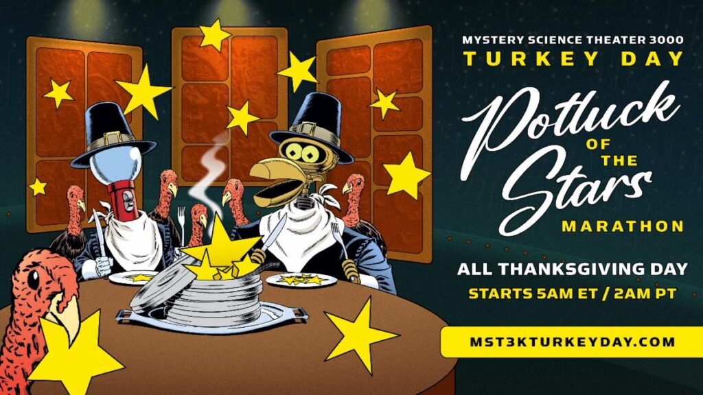 Don’t forget to set your timers for both MST3K Turkey Day Potluck of the Stars Marathon and your turkey, and for the latest updates follow MST3K on TikTok (@mst3kofficial), Instagram (@MST3K), Facebook (facebook.com/MST3K), and X (@MST3K).