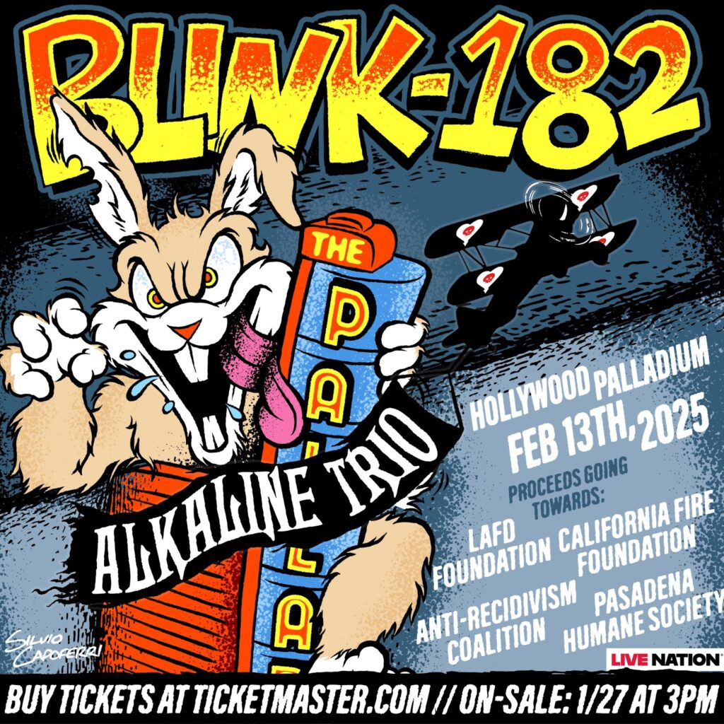 Multi-platinum, award-winning band blink-182 – Mark Hoppus, Tom DeLonge, and Travis Barker — have announced a one night only benefit show at the Hollywood Palladium on February 13th to support LA fire relief. 100% of the ticket proceeds from the Live Nation produced event will be donated to the Pasadena Humane Society, California Fire Department, LAFD Foundation, and ARC Firefighter Fund. Punk band Alkaline Trio – Matt Skiba, Dan Andriano, and Atom Willard – will open as support.