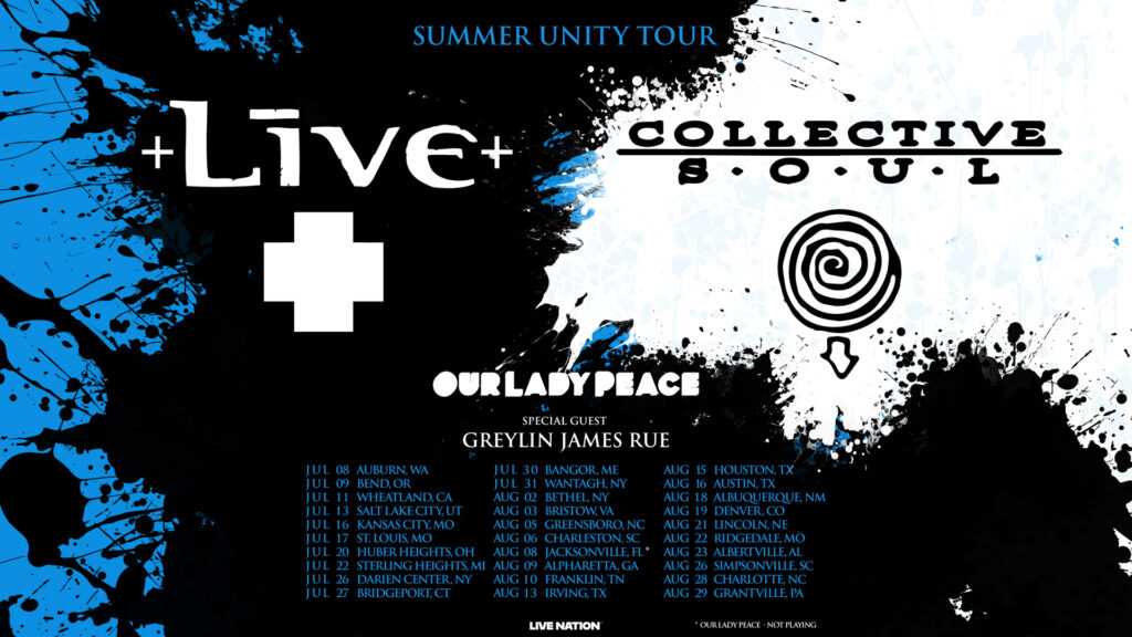 Collective Soul and +LIVE+ announced their 2025 co-headlining Summer Unity Tour! Special guests Our Lady Peace and Greylin James Rue will join on all upcoming dates. Produced by Live Nation, the 2025 Summer Unity Tour marks +LIVE+ and Collective Soul’s first tour together in 17 years, since their extended 2008 co-headline run.
