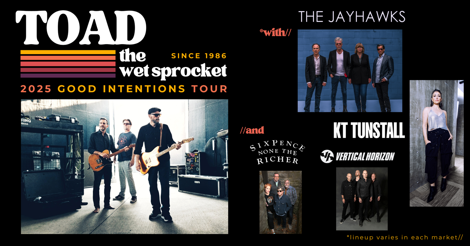 With over three decades of heartfelt songwriting, timeless hits, and an unshakable bond with their fans, Toad the Wet Sprocket remains one of the most enduring acts to emerge from the ’90s alternative rock boom. As they hit the road once again for their coast-to-coast Good Intentions 2025 Tour—joined on select dates by artists like KT Tunstall, Vertical Horizon, and The Jayhawks—the band continues to prove that their music is as relevant and resonant as ever.