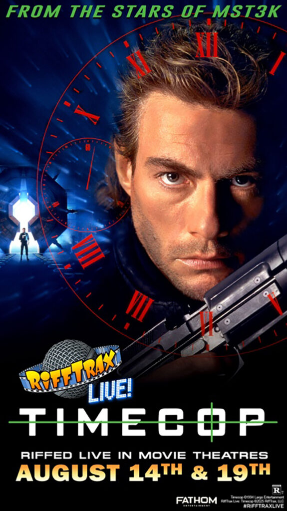 Fathom Events is dialing back the clock—and the logic—for an all-new riffing spectacular! Join comedy legends Michael J. Nelson, Kevin Murphy, and Bill Corbett (of Mystery Science Theater 3000 fame) as they take on one of Jean-Claude Van Damme’s most gloriously absurd sci-fi flicks in “RiffTrax Live: Timecop”, hitting theaters nationwide Thursday, August 14 and Tuesday, August 19 at 7PM (local time).