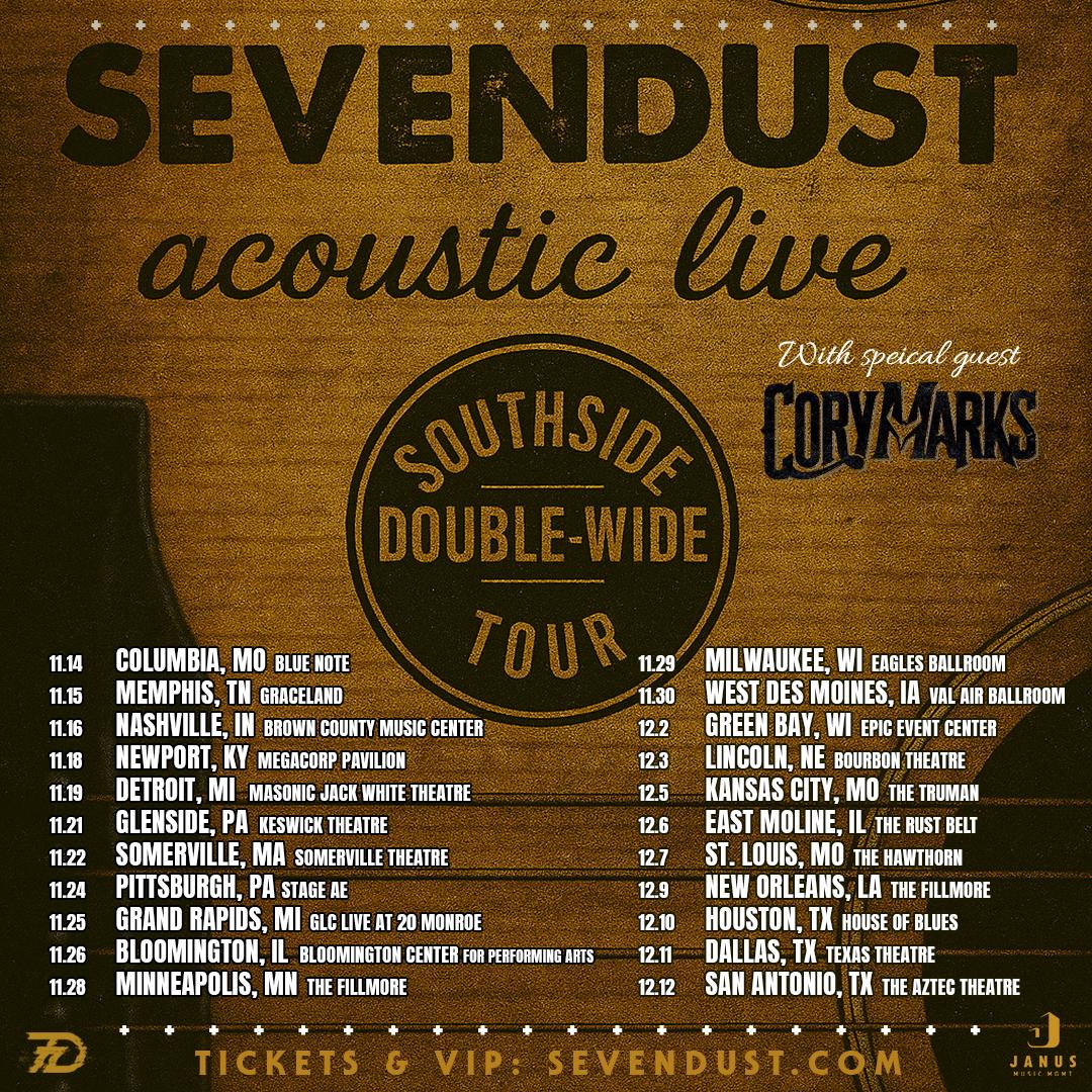 This rare acoustic journey brings a unique perspective to the band’s signature sound, offering an unforgettable night of music. Special guest Cory Marks will be opening the tour. Information on tickets for all shows as well as VIP packages can be found at www.sevendust.com.