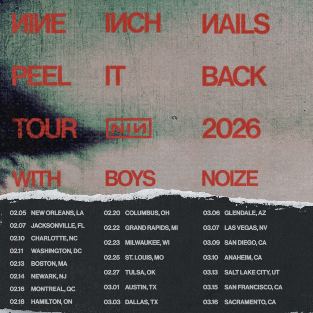 Nine Inch Nails has announced the second North America leg of their critically acclaimed Peel It Back Tour. Produced by Live Nation, the new dates kick off Thursday, February 5 in New Orleans, LA at Smoothie King Center, with stops in Washington, DC, Montreal, Austin, Las Vegas, San Francisco, and more before wrapping Monday, March 16in Sacramento, CA at Golden 1 Center. Friend and collaborator Boys Noize will join the band again on all upcoming dates.