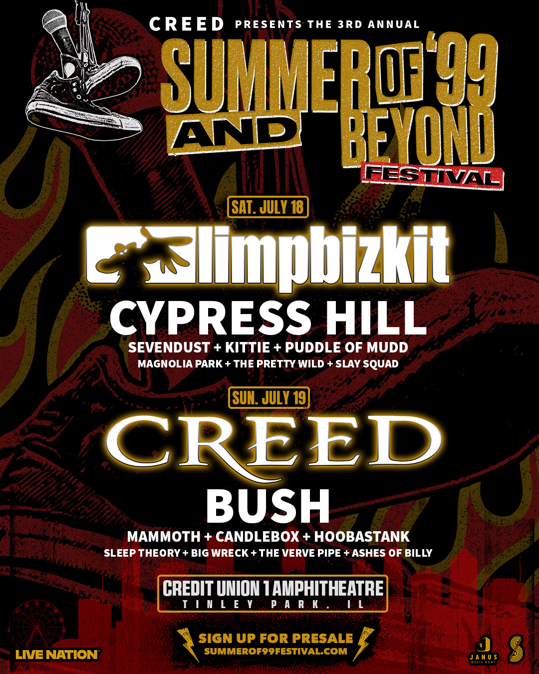 Rock fans, are you ready? Multi-platinum giants CREED and Limp Bizkit are joining forces to headline the 3rd Annual Summer of ‘99 and Beyond Festival on Saturday, July 18 and Sunday, July 19 at the Credit Union 1 Amphitheatre in Tinley Park, IL.