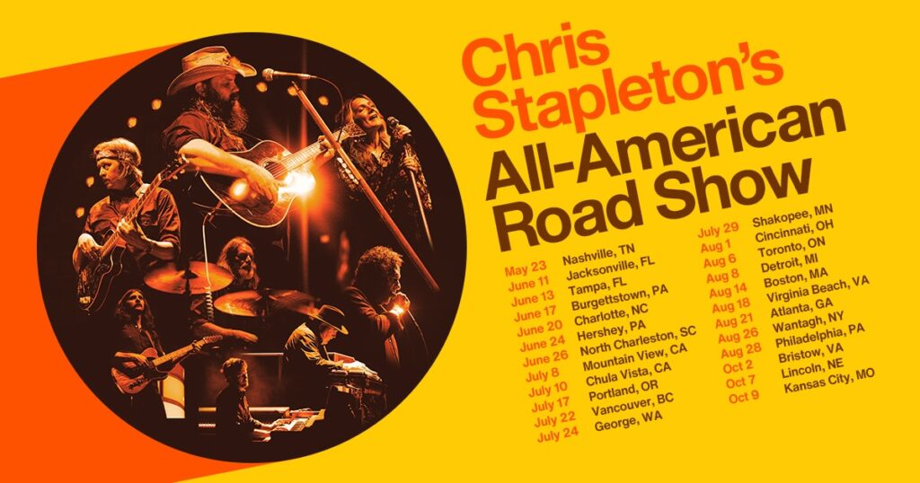 11x Grammy, 19x CMA and 21x ACM Award-winner Chris Stapleton will continue his “All-American Road Show” through this fall with over 20 newly confirmed stops, including Nashville’s Nissan Stadium, Atlanta’s Mercedes-Benz Stadium and Detroit’s Ford Field with very special guest Lainey Wilson as well as Toronto’s Rogers Stadium and Boston’s Fenway Park with very special guest Zach Top among many others. See below for complete tour itinerary.