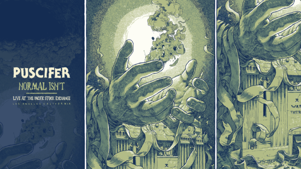 The Pusciverse – As the countdown to the Feb. 6 release of Puscifer’s fifth studio album, Normal Isn’t, continues, the band is inviting fans to celebrate at select independent record stores with early screenings of their new concert film, “Normal Isn’t: Puscifer Live at the Pacific Stock Exchange.”